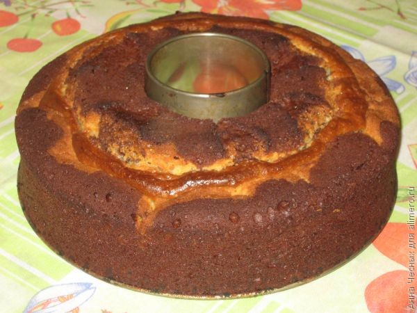 Grease the cake pan with butter or margarine, lightly sprinkle with flour. Pour the dark dough first, followed by white.