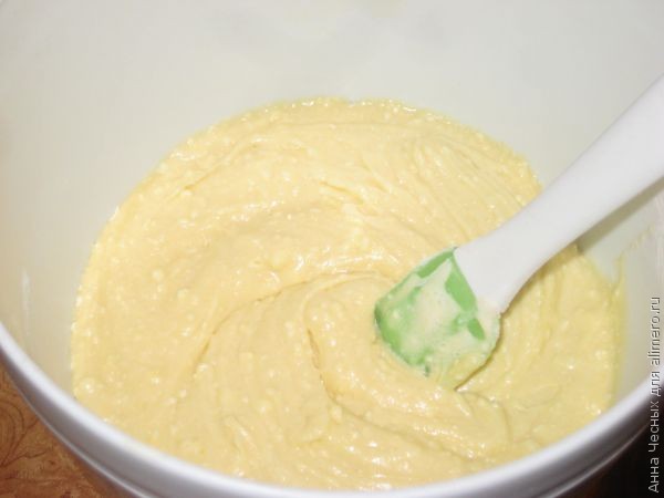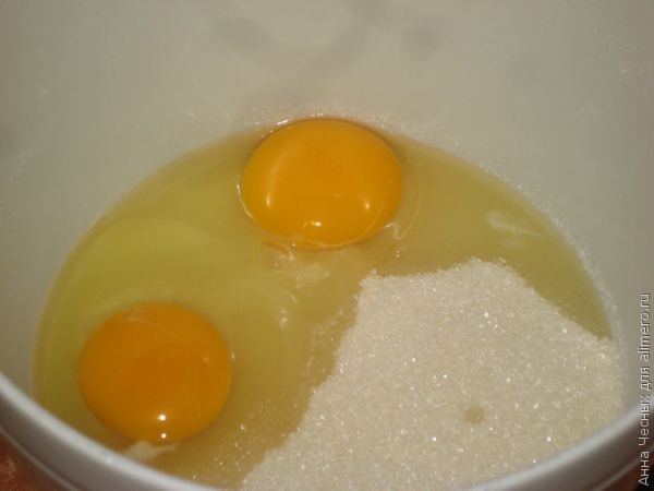 Put a pack of margarine out of the fridge and let it stand warm for the margarine to melt, but do not soften it in a microwave or on fire until it is liquid! Divided margarine divided into several parts and slightly whisk with a whisk with eggs, sugar and sour cream. No need to bring to a uniform consistency, even if small lumps remain, so the cake will be softer and tender.