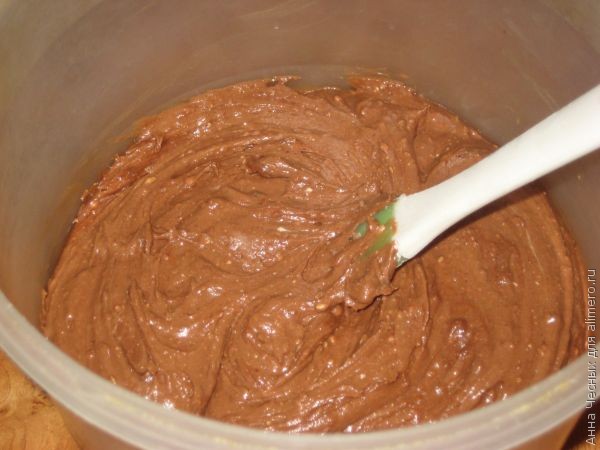 Mix both sides of the dough gently. It should turn out, on a consistence, as thick sour cream. Cocoa dough will be slightly denser than light.