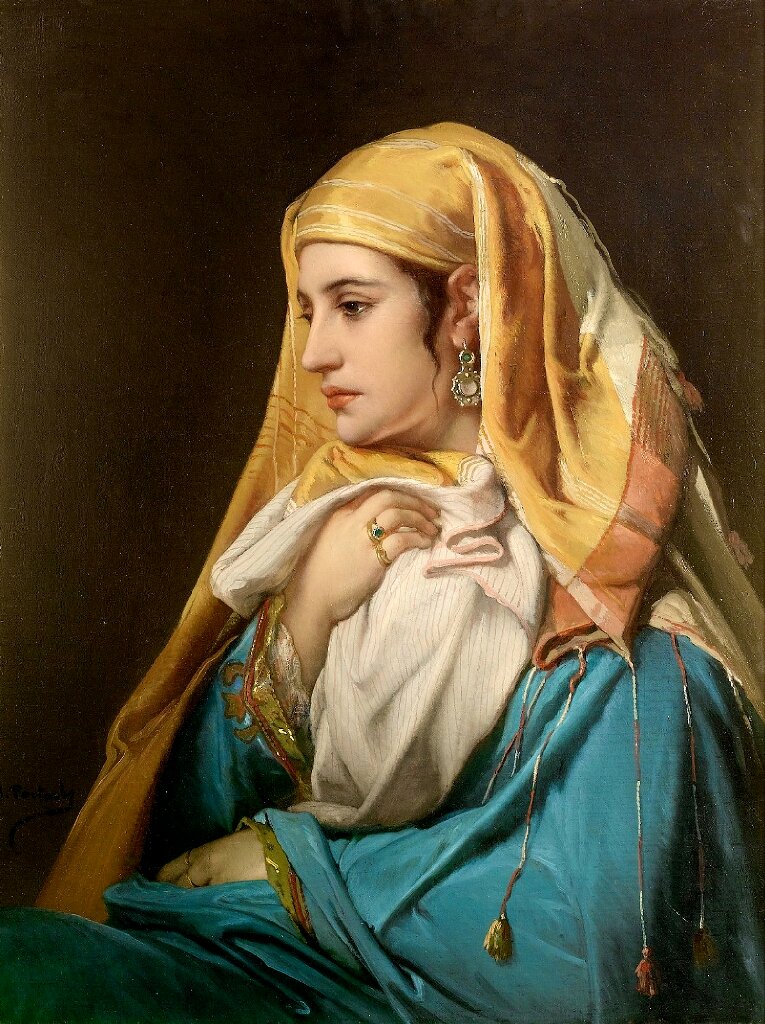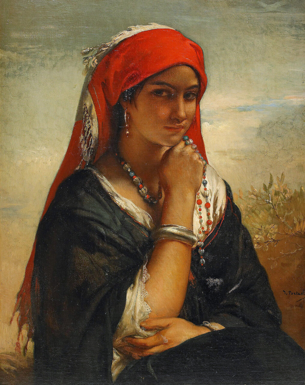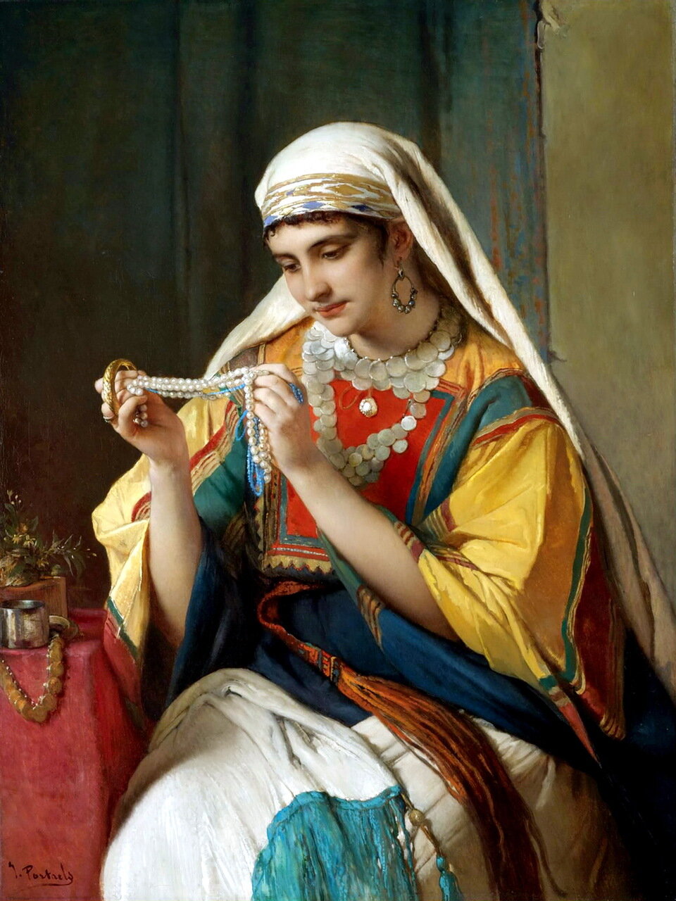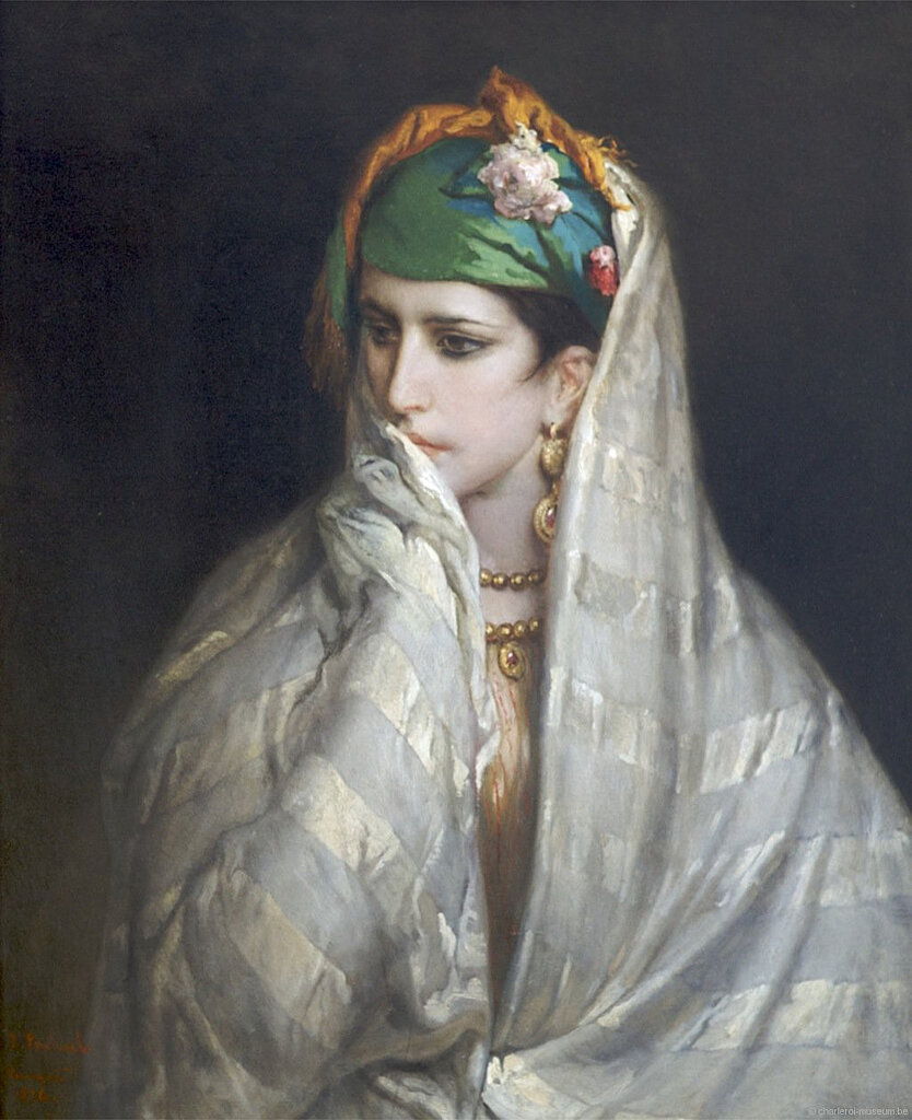 Portaels remained removed from the conventions of his time in the way he treated his subjects, as exemplified in his classic vision of the exotic theme of the Oriental woman. He returned numerous times to the aesthetic type of the 'Oriental woman' which he depicted with typically arched eyebrows and languid, almond-shaped eyes. These works are executed in a rather stiff manner. Only in his rare portraits of children did he attain more spontaneity such as in the Portrait of a young Arabic girl (At Jean Moust Gallery). Portaels is seen as the principal painter who led the fashion for Orientalism in Belgium.
