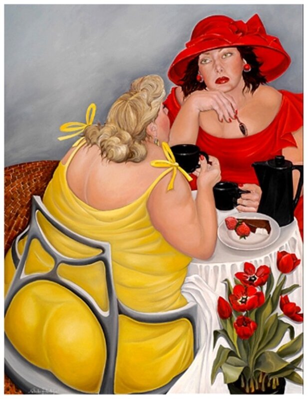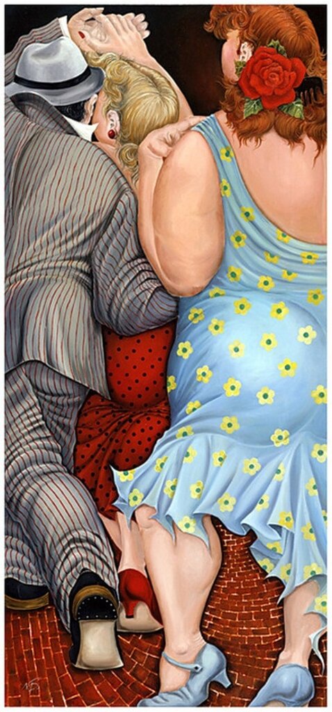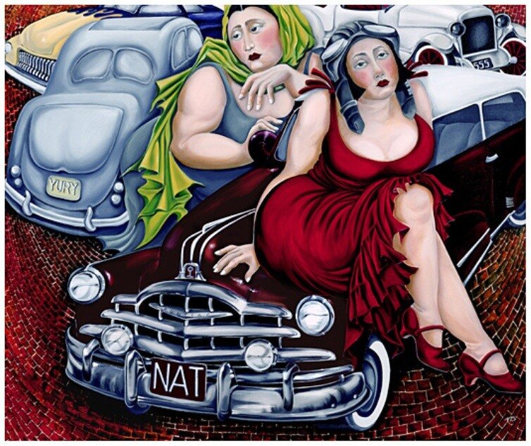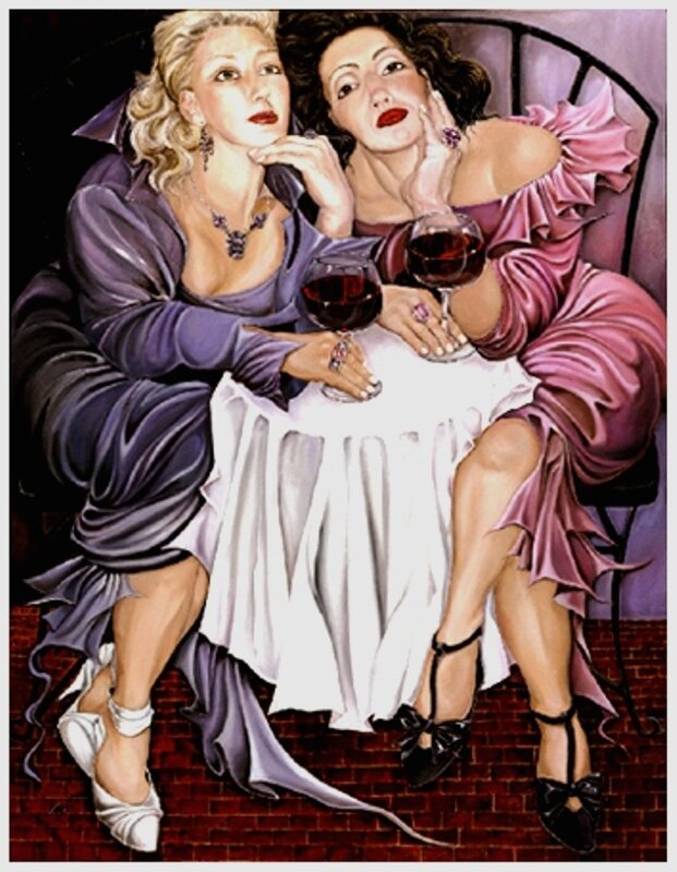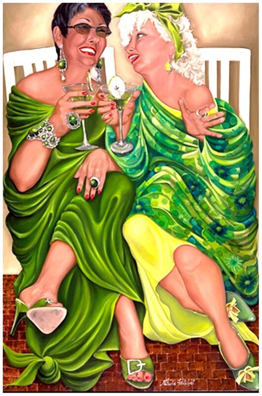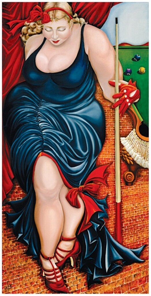In her continuing work as a fashion designer and illustrator, Natasha treats the fabric as a means to cling to the body, revealing powerful, yet feminine, full-bodied women. Her stylized powerful, yet feminine, full boded women of fabric is reminiscent of Tamara de Lempicka’s Art Decofemale figures. “The Good Life” is portrayed by the pursuit of worldly pleasures of dancing, singing, playing pool or simply enjoying a glass of wine. All are painted with a reverence for exquisite detail and rich texture. Her women are larger then life, confident, and often fill the perimeters of the canvas. We are voyeurs catching a glimpse of their lives as if gazing through a secret peephole or looking glass. The soft sensuality of flesh is contrasted with the stylized and foreshortened background much like the Viennese artist Gustav Klimt, who used the technique of a gold or geometric backdrop to heighten the effect.