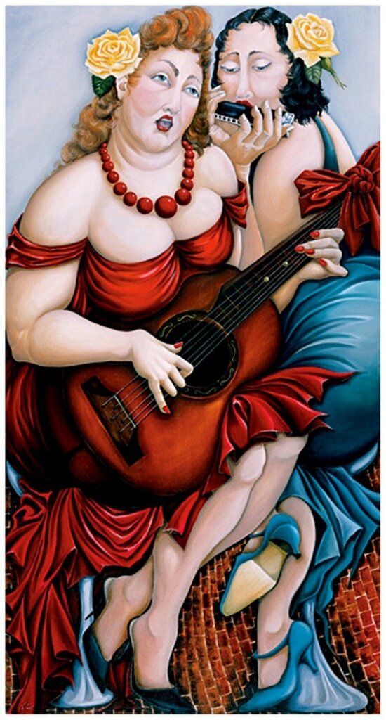 Upon gazing at Natasha’s art, you are immediately drawn into the realism of the senses. Whether she is depicting an intimate duo of guitar and harmonica in “Love Song”, or the frenetic dance of two women in “Party Animals”, the canvas beckons us to partake in the exuberant joy and sensuality of Life and surrounds us.