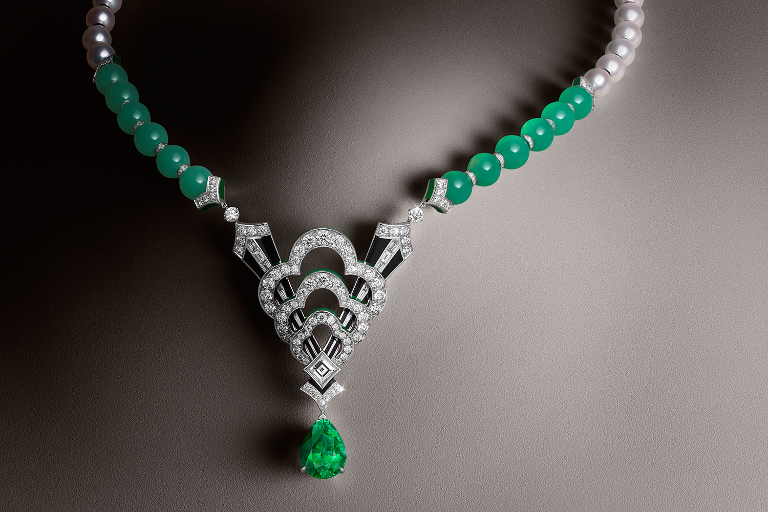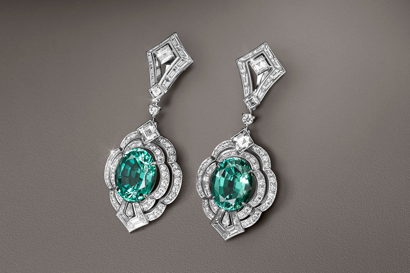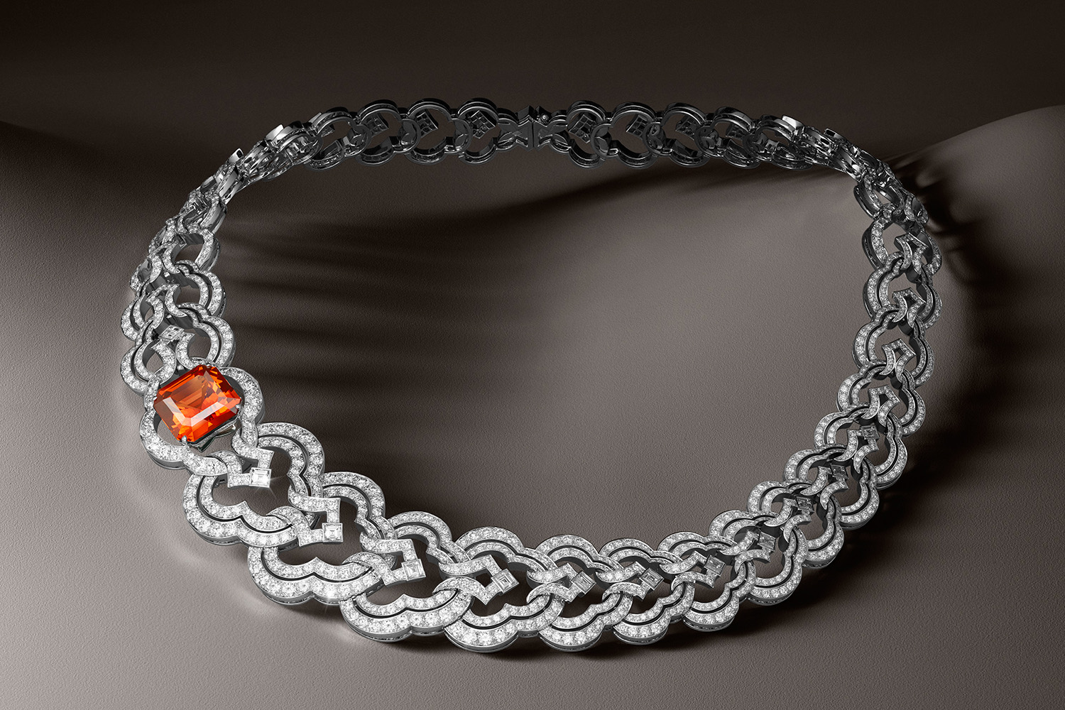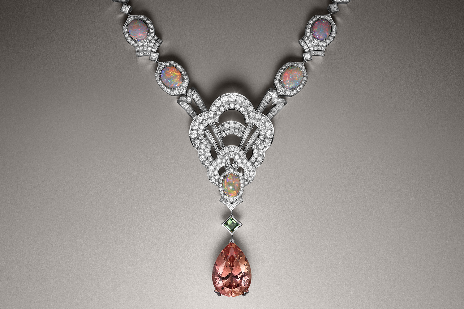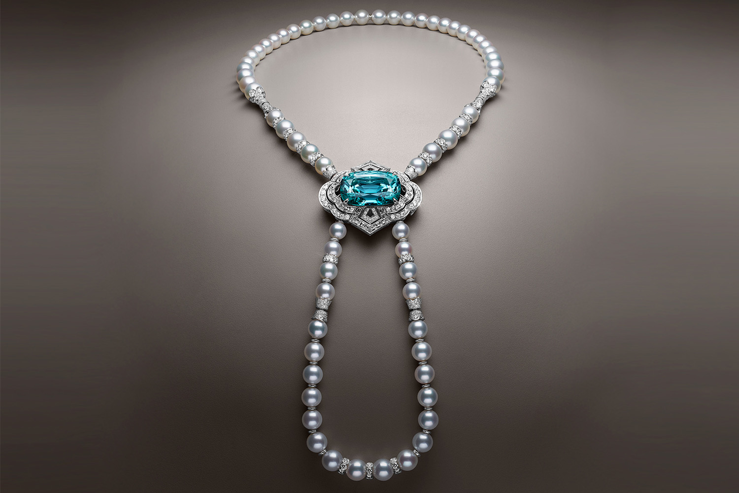 The collection includes three necklaces: one is a long pearl chain with diamonds, adorned with blue tourmaline 54.3 carats; the second is inlaid with tangerine pomegranate weighing 16.82 carats; third, it shines with a unique imperial topaz of 37.07 carats.